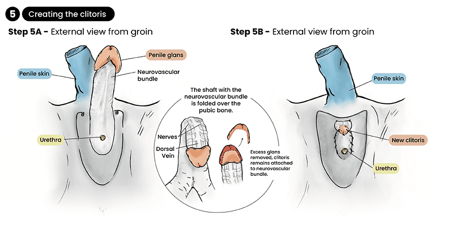 After the penis is removed, the glans will still be connected to their original blood and nerve supply. The penile glans is re-sized and positioned at the top of the vulva, becoming the clitoris.