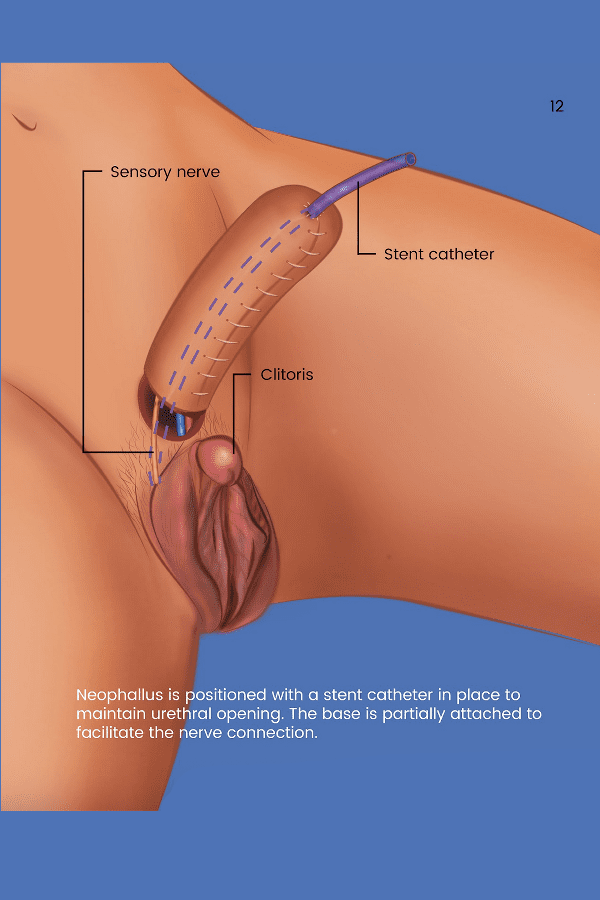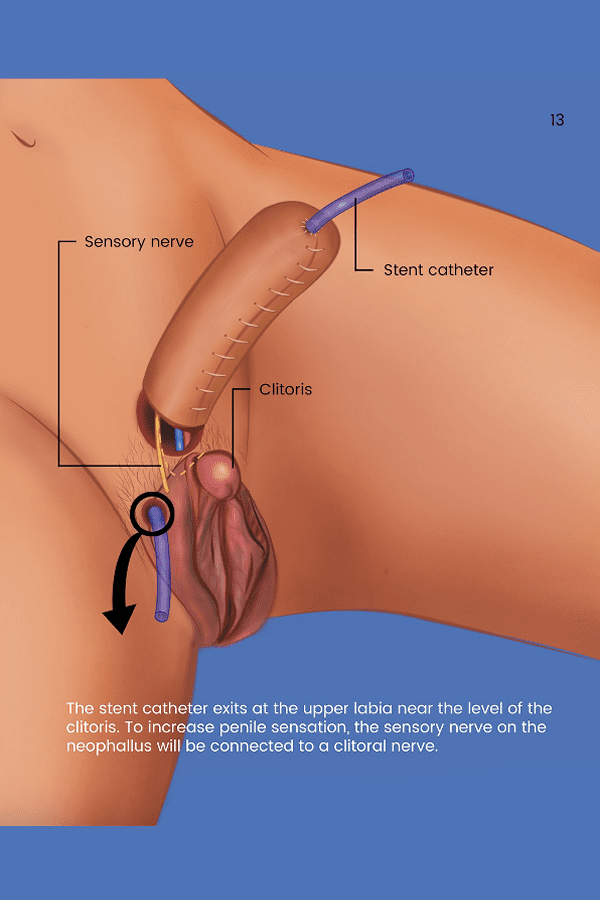 The stent catheter will exit around the top of the labia majora. The nerve in the penis (from the forearm) is drawn out.