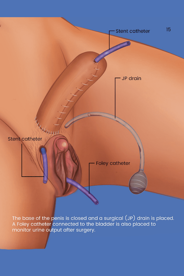 A foley catheter is placed at the site of the original urethral opening, connecting it to the bladder, alongside a surgical drain.