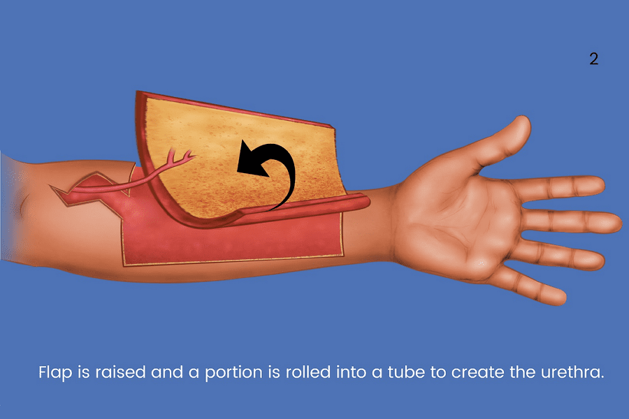 In this stage of surgery, a flap of skin, called a full-thickness skin graft, is removed from the forearm. A portion of the flap is rolled up to create the urethra. This will go inside of the penis shaft to extend the existing urethra so that urine exits at the tip of the penis.