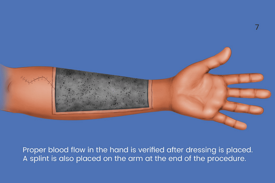 Once the open wound on the forearm is dressed and closed, your surgeon will put it in a splint.