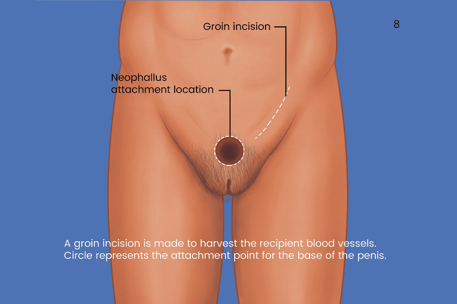 The phallus will be attached on the groin, indicated by the circle. Another incision is made on the groin to access blood vessels.