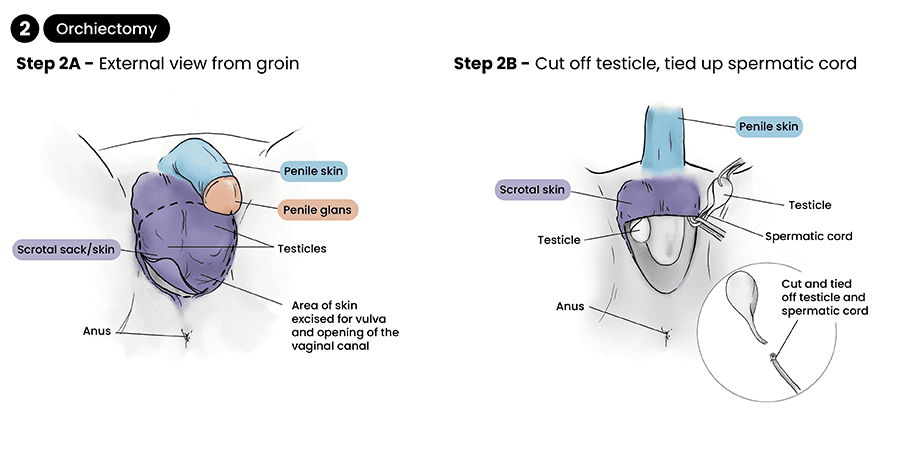 Patients can undergo an orchiectomy (testicle removal) 8-12 weeks prior to surgery or it can be conducted at the same time as a vaginoplasty. If patients undergo an orchiectomy before vaginoplasty, their scrotal skin should be preserved so it can be used in the construction of the labia and the vaginal canal. Testicles will be sent for pathology testing after removal.