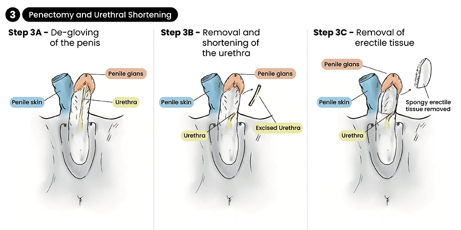 In this stage of surgery, the penis is de-gloved, meaning that the skin is separated from the shaft so that it can be used for the lining of the vaginal canal. The erectile tissue is then removed from the penis shaft and the urethra shortened.