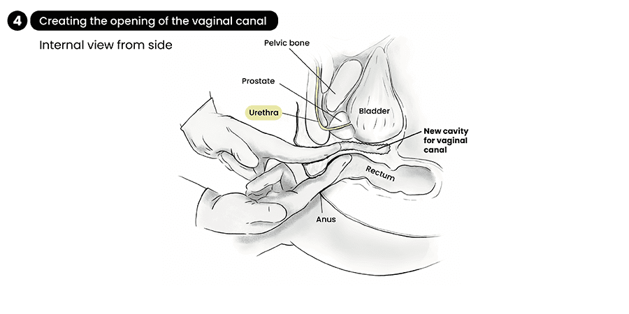 A cavity is created so that the vaginal canal is positioned below the prostate and above the rectum. Depending on a patient’s anatomy, the vaginal canal typically has a depth of 5-6”.