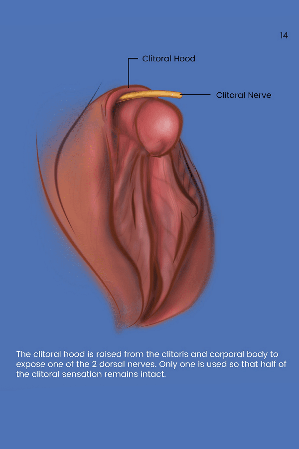 The dorsal nerves of the clitoris are exposed. Dr. Ley will take one of the two and connect it to the nerve in the penis (from the forearm) through microsurgery. The second dorsal nerve will remain connected to the clitoris.