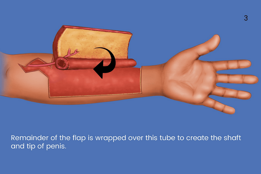 The forearm’s radial artery and nerves are taken and attached to the penis, giving it a blood and nerve supply.