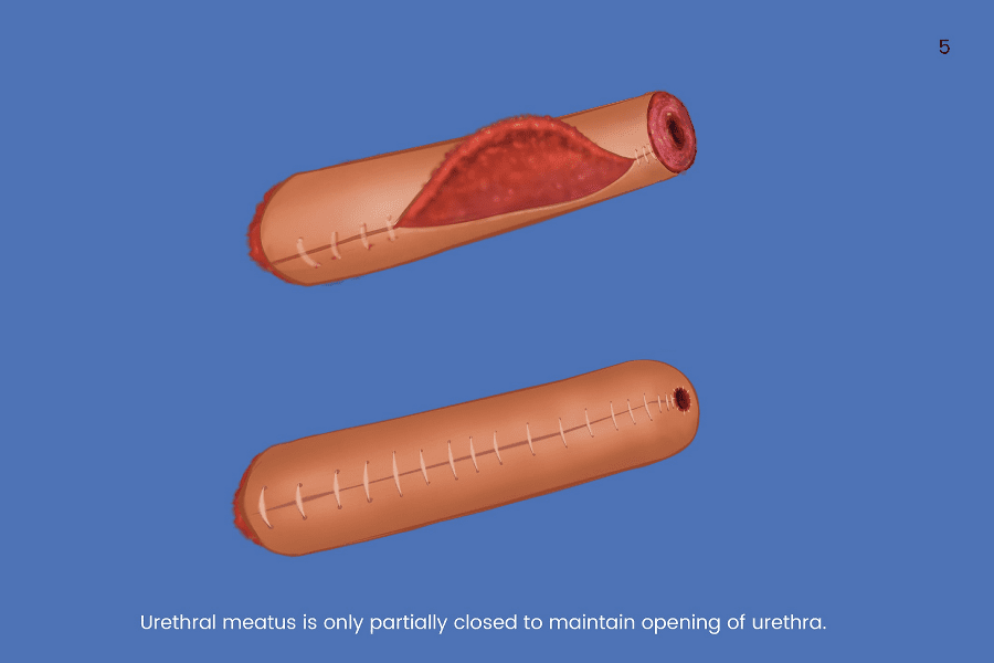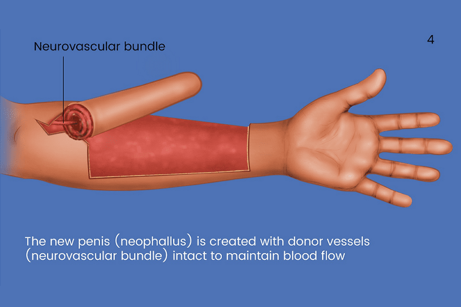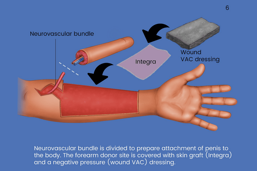 The neurovascular bundle is detached from the forearm so that it is connected to the penis. Then, a split-thickness skin graft (usually taken from the thigh) is placed over the open wound on the forearm, alongside a negative pressure wound dressing.