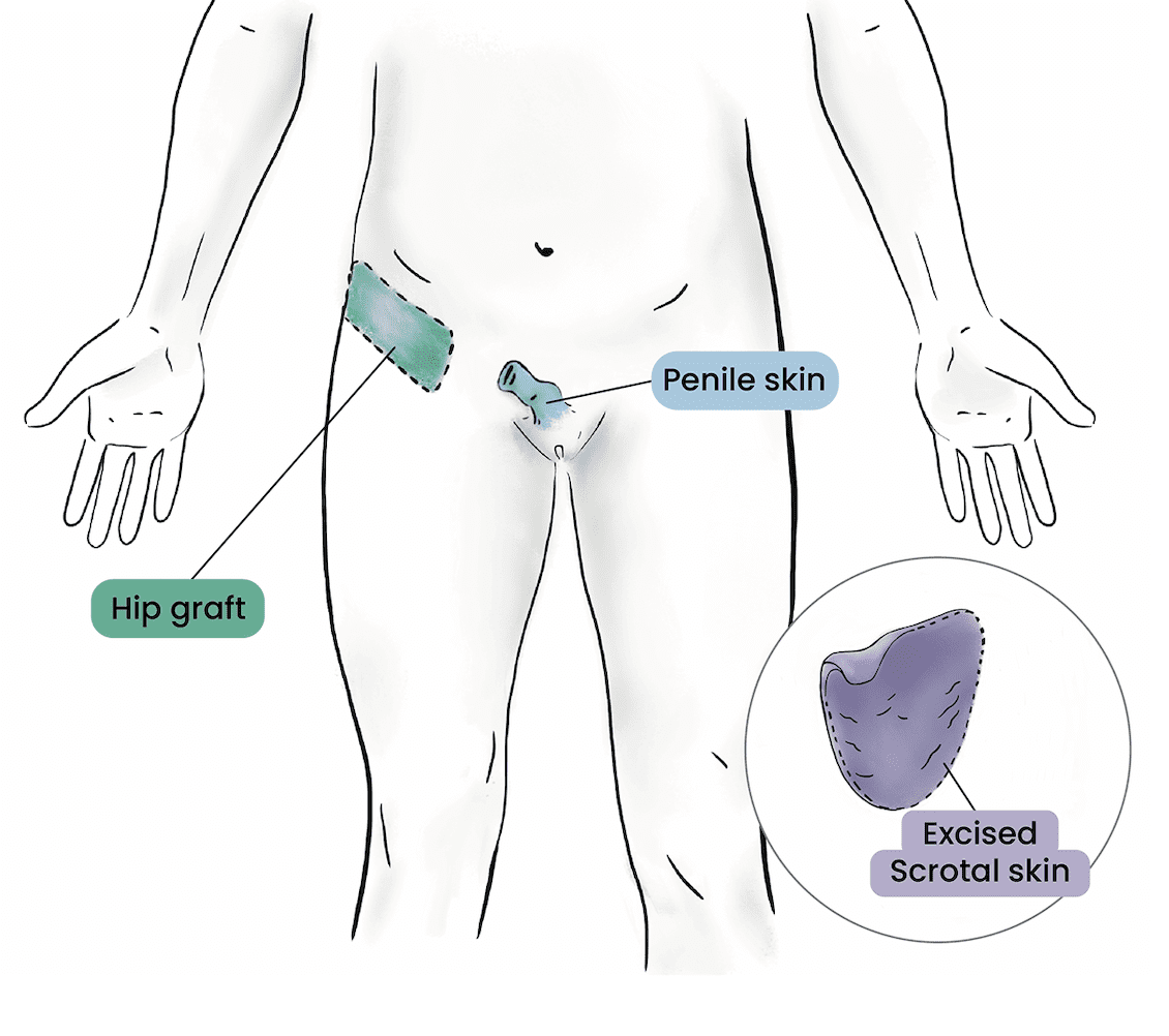 In some instances, Dr. Zara Ley (she/her/they), may take a skin graft from one or both sides of the hip to construct the vaginal canal alongside penile and scrotal skin. In the case that this skin graft is taken, a medium sized scar––a line approximately 3-6 inches in length––will be discretely tucked into the fold of the hip.