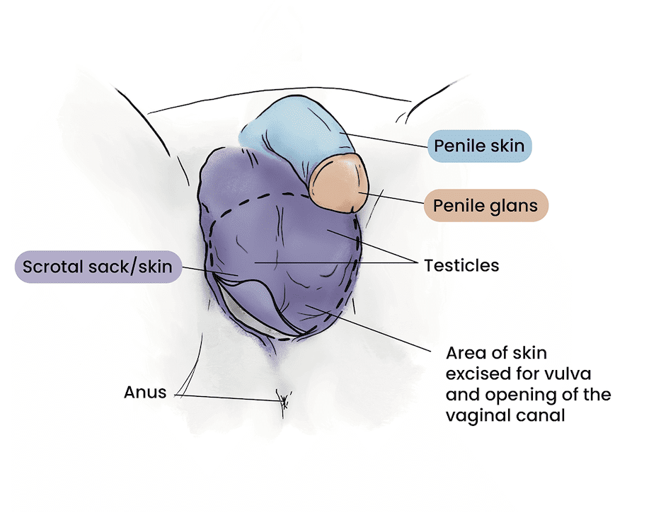 For any vaginoplasty procedure, an incision will be made to excise the scrotal pouch, as pictured below.