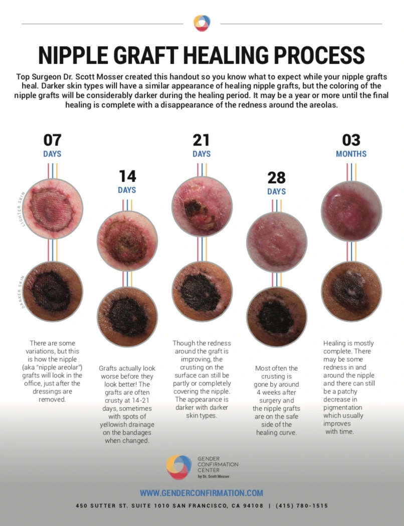 It can take up to a year or more until the final healing of nipple grafts is complete and the redness around the areolas has disappeared. When nipples heal it is normal for them to look worse before they look better, especially around 14-21 days after surgery. Our surgeons have created a visual breakdown of what most nipples look like from 7 days after top surgery all the way up to 3 months. For a printable version of the nipple healing process pictured below, click here.